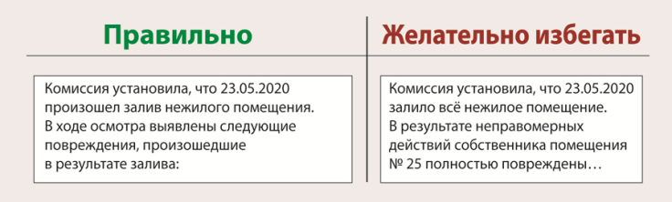 В акте фиксируют только факты, действия, события, которые точно установлены. Фиксация оценочных суждений в акте недопустима.