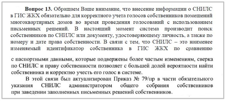 Использование СНИЛС. Жилищный кодекс РФ и иные НПА не обязывают УО и ТСЖ собирать такие данные собственников помещений в МКД, но указывать их в системе нужно – согласно п. п. 18.4.2.1.2, 1.22.2.1.2 разд. 11 приказа № 79/пр. И Минстрой РФ настаивает на необходимости размещать СНИЛС в ГИС ЖКХ.