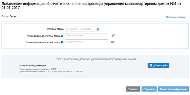 Чтобы добавить отчет об исполнении договора управления в ГИС, выберите нужный договор управления и нажмите кнопку «Добавить отчет о выполнении договора управления». В открывшейся форме нужно указать отчетный период, сумму доходов и расходов и прикрепить сам отчет.