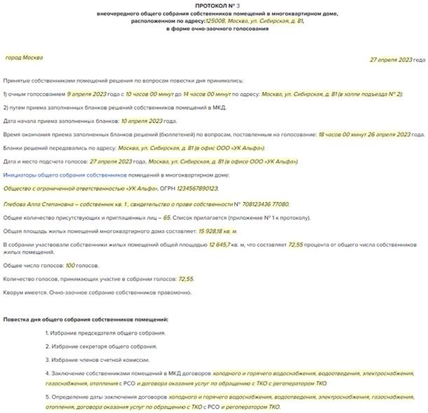 Принятые решения оформите протоколом. Документы общего собрания собственников передайте в ГЖИ и РСО.