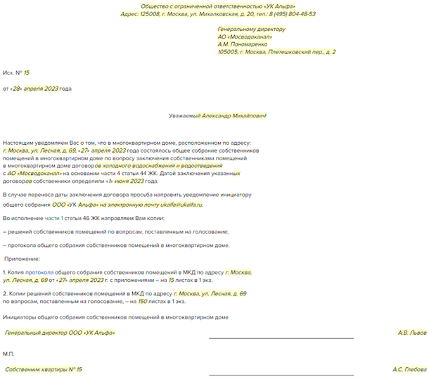 Вместе с протоколом ОСС о переходе на прямые договоры оформите сопроводительное письмо, в котором укажите решения, принятые собственниками в части заключения соответствующего договора с РСО.