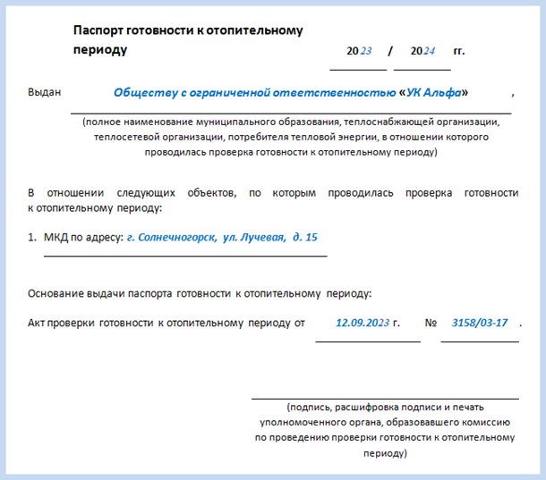 Сроки выдачи паспортов определяются руководителем или заместителем органа МСУ в зависимости от особенностей климатических условий, но не позднее 15 сентября. Если МКД не получил паспорт готовности в установленный срок, УО, ТСЖ, ЖСК обязаны продолжить подготовку. На рисунке 5 смотрите пример паспорта готовности к отопительному периоду.