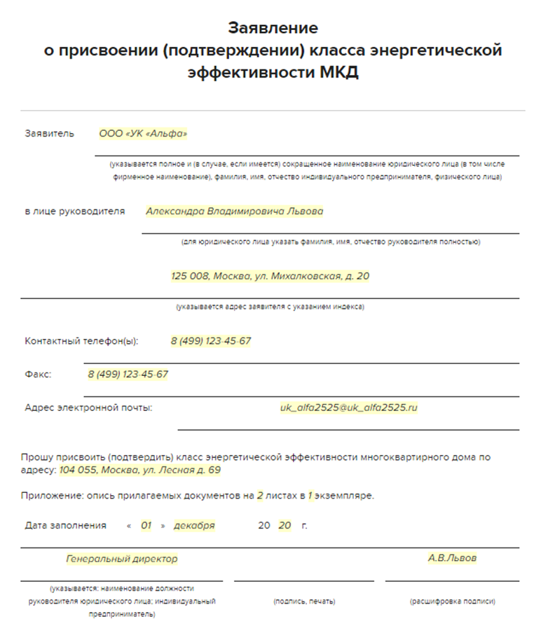 Рисунок 2. Пример заявления о присвоении (подтверждении) класса энергетической эффективности МКД