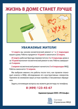 Ведите активную информационную работу, чтобы повысить лояльность жителей. Делайте это всеми способами: на инфостенде, в соцсетях, в мессенджерах. Предупреждайте, какие работы будете проводить, рассказывайте, что сделано за месяц, квартал. Покажите, что в рамках содержания и ремонта общего имущества работы не только планируются, но и выполняются.