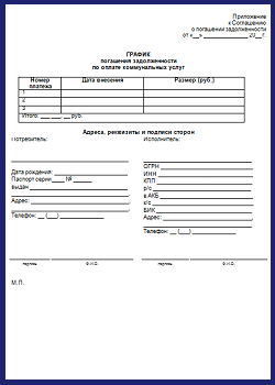 Документы целесообразно подготовить заранее, при необходимости от руки вписать удобный должнику график погашения задолженности. Пример соглашения и графика вы можете скачать.