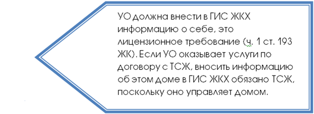 Информацию об управляющей организации в ГИС ЖКХ размещает сама организация. При этом если домом управляет УО по договору управления с ТСЖ, ЖСК, то жилищные объединения также обязаны разместить в системе информацию о себе (см. рисунок 1).