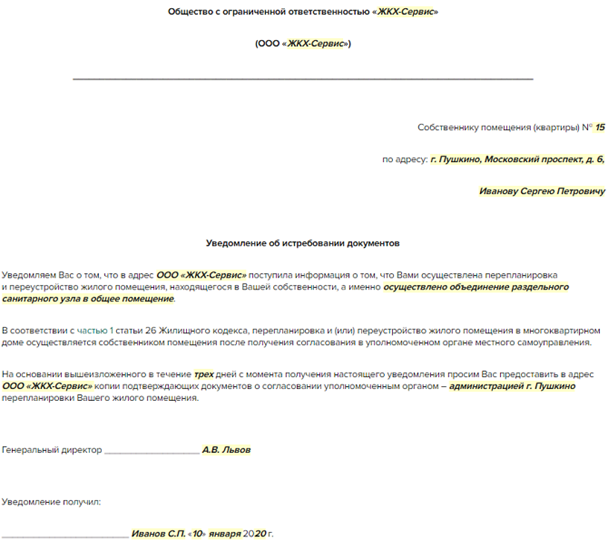 Пример уведомления об истребовании документов у собственника, подтверждающих законность перепланировки помещения