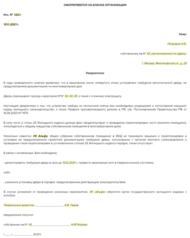 Составьте уведомление о необходимости демонтировать незаконную перепланировку в простой письменной форме. В уведомлении укажите срок, в который нужно демонтировать незаконную конструкцию, перегородку, тамбурную дверь, и предупредите, что затем обратитесь в надзорные органы.