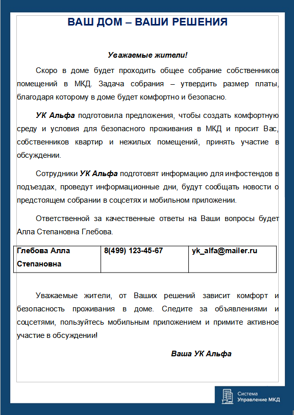 Инфостенд. Подготовьте и разместите на инфостенде объявление о том, что в скором будущем пройдет ОСС об утверждении размера платы. Сделать это нужно за два месяца до собрания. Пример объявления – на рисунке 2.