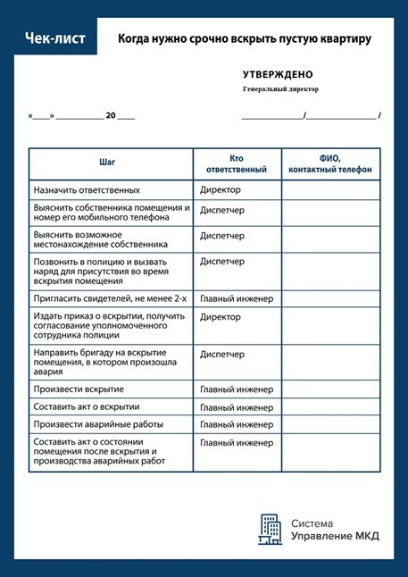 Вот чек-лист из 11 шагов для ситуации, когда нужно срочно получить доступ в помещение, в котором никого нет. О них должны знать все сотрудники УО, ТСЖ, ЖСК.