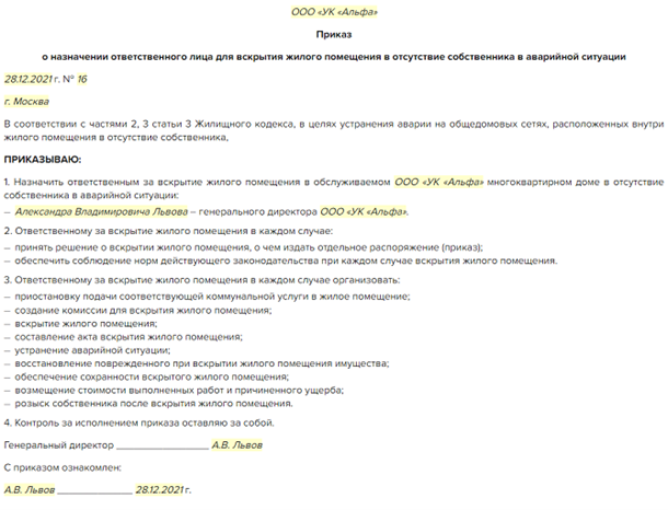 Определите ответственного в УО, ТСЖ, ЖСК, кто вправе принять решение о вскрытии аварийной квартиры. Ответственный должен будет определить, спустя какое время с начала аварии запустить процедуру вскрытия, и подписать соответствующий приказ.
