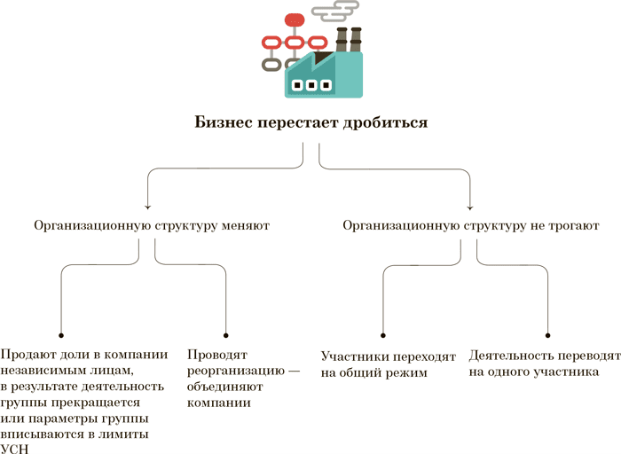 Объединить компании в одну вовсе не единственный путь. Можно, наоборот, распродать бизнес реально независимым лицам и прекратить вести деятельность как группа. Можно и совсем не проводить никаких организационных изменений, а просто перейти на общий режим. ФНС подсказала четыре варианта (схема ниже).