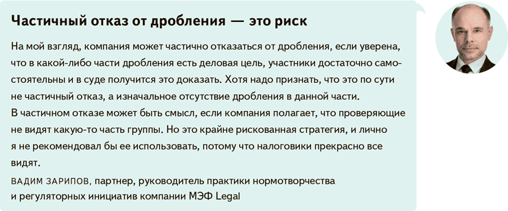 Возникает вопрос: зачем частичный отказ от дробления нужен бизнесу? Здесь может быть два варианта. Первый — компания рассчитывает доказать, что незаконного дробления больше нет. Второй вариант — компания надеется, что налоговики не смогут вычислить оставшуюся часть схемы.