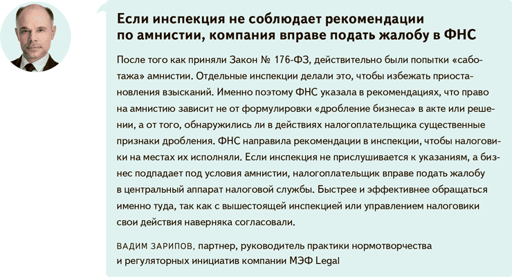ФНС лишила смысла уловки инспекторов. Не важно, как они назвали нарушение. Если консолидируют доходы или другие показатели, значит, нашли дробление. То есть компания или ИП вправе претендовать на амнистию (п. 7 приложения к письму ФНС № СД-4-2/11836). Теперь появился аргумент на случай, если инспекторы незаконно пытаются взыскать доначисления. Даже если в акте или решении ИФНС нет формулировки о дроблении, налоговая амнистия для бизнеса все равно будет возможна.
