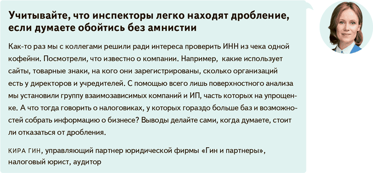 Владельцы бизнеса могут считать, что налоговики не заметят дробления, поэтому идти на амнистию не стоит. Но юристы предупреждают: обнаружить признаки дробления просто. Для этого достаточно, например, изучить сайт компании или уголок потребителя. Тогда на проверке ИФНС потребуется только собрать доказательства.