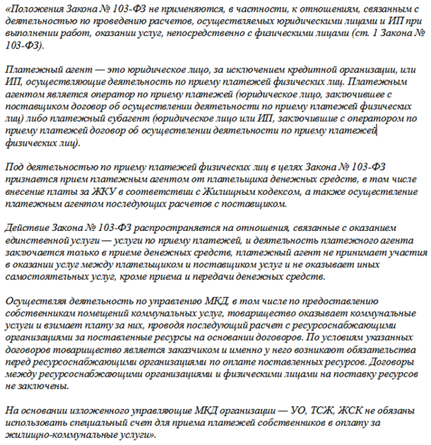 При такой схеме жители оплачивают квитанцию не напрямую в адрес УО, ТСЖ, а в кассу или на счет РКЦ. Далее РКЦ распределяет и перечисляет собранные средства поставщикам услуг: УО, ресурсникам. Чтобы получить средства от РКЦ, УО, ТСЖ обязаны использовать специальный банковский счет. Поставщик не вправе получать средства от платежного агента на обычные расчетные счета (ч. 18 ст. 4 Закона № 103-ФЗ). Платежным агентом не могут быть почта и банк.