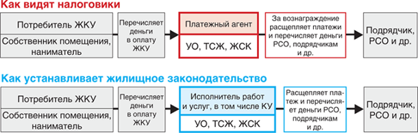 На рисунке 1 мы показали два взгляда на движение платежей за ЖКУ с двух разных позиций: налоговиков и жилищного законодательства. Схему взяли обычную – когда собственники не перешли на прямые договоры с РСО.