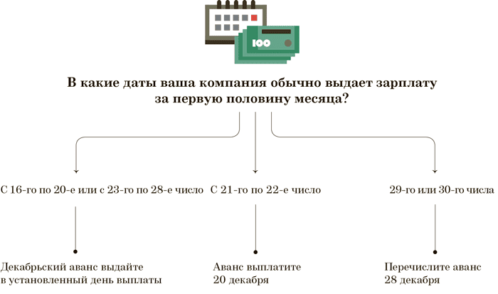 На вторую половину декабря могут выпасть сразу две выплаты: декабрьский аванс и расчет за декабрь. Конкретная дата выдачи денег зависит от того, в какие сроки обычно расплачиваетесь с работниками. Сроки для выплат за декабрь смотрите на схемах 1 и 2.