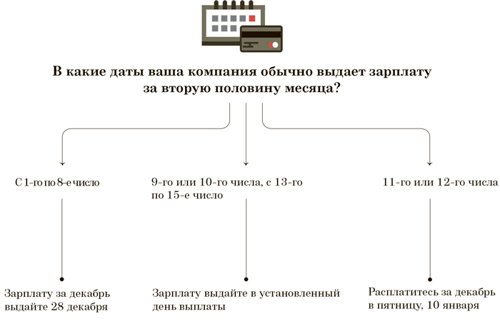 Например, рассчитываетесь с сотрудниками за месяц 5-го числа. Зарплату за декабрь выдайте не позднее субботы — 28 декабря. Это актуально, даже если компания работает по шестидневке или ежедневно.