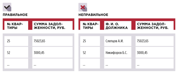 Обезличенными можно признать данные, по которым невозможно определить конкретного человека без использования дополнительной информации (п. 9 ст. 3 Закона № 152-ФЗ). Поэтому УО, ТСЖ, ЖК, ЖСК вправе размещать в общедоступных местах МКД списки должников, если указывают в них только номера квартир и суммы задолженностей (рисунок 1).