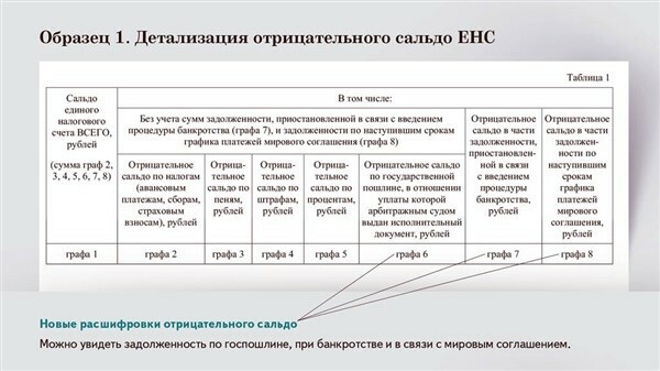 В справке появились новые таблицы, где налоговики расшифруют отрицательное сальдо при банкротстве и мировом соглашении: конкретный налог, срок уплаты, сумма и т. д. Банкроты смогут свериться по задолженности, которая попала в конкурсную массу. А участники мирового соглашения проследят, чтобы налоговики в бесспорном порядке не списали лишнего.