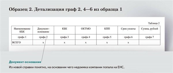 Отрицательное сальдо в разрезе каждого налога инспекторы детализируют в таблице 2 приложения 1. Таблица с таким же содержанием есть в действующей форме. Но в новой справке, помимо наименования платежа, КБК, срока уплаты, суммы, ОКТМО, КПП, будет и документ-основание. Станет видно, по какому документу недоимку отразили на ЕНС: декларация, решение по проверке и пр.
