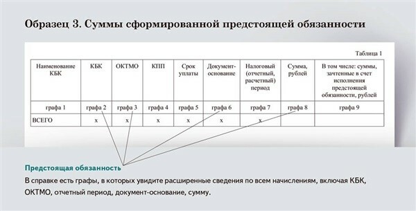 Суммы к уплате. С помощью справки сможете проверить, корректно ли отражены ваши декларации и расчеты на ЕНС. Это потребуется, например, если при подаче отчетов был сбой или вы делали корректировки. В справке покажут, какие обязательства числятся за вами и какой срок их погашения. Суммы, которые надо заплатить, найдете в приложении 4 к справке с детализацией сведений о совокупной обязанности. По каждому КБК, ОКТМО и КПП инспекторы отразят срок уплаты, период, документ-основание, начисленную сумму, уменьшенную обязанность, исполненную обязанность и неуплаченный остаток. В старой форме справки такой информации не было.