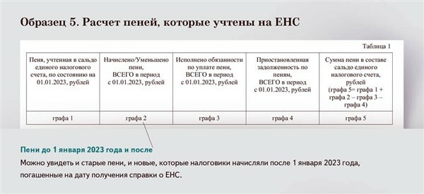 В справку включили и данные о пенях, учтенных в сальдо ЕНС по состоянию на 1 января 2023 года, сумму начисленных и уплаченных пеней после этой даты и сумму пеней в сальдо ЕНС.