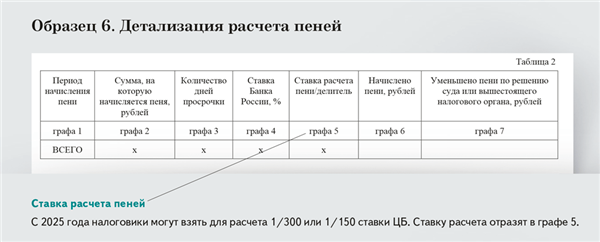 Напомним, что с 2025 года правила по пеням усложнили. Если раньше их считали по 1/300 ставки ЦБ, то теперь пени с 1-го по 30-й день задержки платежа начисляют исходя из 1/300 ключевой ставки, с 31-го по 90-й день — из 1/150 и с 91-го дня — опять из 1/300. Чтобы вам было понятнее, налоговики покажут ставку, которую использовали.
