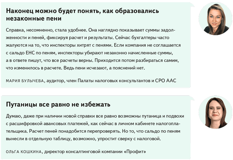 Сейчас справка показывает, есть ли на едином счете деньги на дату выдачи справки и сколько. Если сальдо отрицательное, получаете дополнительно детализацию — по каким налогам задолжали. К справке об отрицательном сальдо ИФНС прилагает расчет пеней. На этом все.