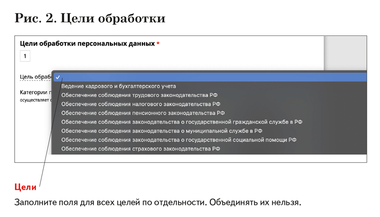 Понадобится не одно уведомление, а десяток. Ваша компания наверняка отчитывается в налоговую, ведет бухгалтерский и кадровый учет, и при этом вы используете персональные данные работников. Это уже две разных цели, с которыми вы обрабатываете персональные данные. Скорее всего целей будет намного больше, ведь еще надо оформлять пропуска клиентам, отправлять рассылки, публиковать чьи-то данные на сайте и т.д. На каждую цель потребуется заполнить свой раздел с перечнем данных, которые вы будете обрабатывать. Объединить цели и написать их через запятую никак нельзя, даже если перечни данных по ним полностью совпадают. Бухгалтеры жалуются на такую систему, но в Роскомнадзоре подтвердили — упростить эту работу никак не получится. Придется делать 10 раз одно и то же.