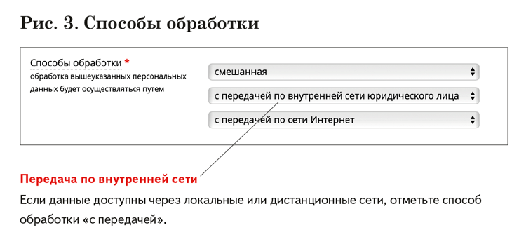 Отметьте, передаете ли вы данные по внутренней сети и по интернету. Как нам разъяснили в Роскомнадзоре, если у компании в принципе есть внутренняя локальная сеть, то нужно указать «с передачей по внутренней сети». При этом у организации может быть и 10 компьютеров, но если нет локальной сети, то укажите «без передачи по внутренней сети».