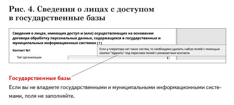 Компании интересуются, надо ли там записывать всех сотрудников, которые могут увидеть персданные, а также посторонних, например специалистов, которые приходят обслуживать 1С. В Роскомнадзоре сообщили, что раздел касается только владельцев государственных и муниципальных систем. Заполнять его обычным компаниям не нужно, но и оставить пустым при отправке нельзя. Поэтому, если ваша компания не работает с базами данных госорганов, удалите все поля.