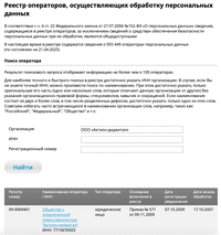 После того как направили уведомление, проверьте, появилась ли запись в реестре. Достаточно вбить ИНН организации. Если кликните на строчку с наименованием компании, увидите, что именно указывали в документе. Справа на полях смотрите скриншот, как выглядит поиск компании в реестре Роскомнадзора.