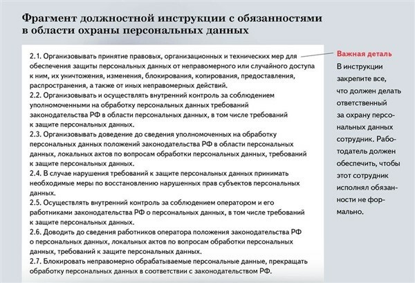 Ответственный будет обязан защищать персональные данные, если это прописано в его должностной инструкции (п. 1 ст. 18.2 Закона № 152-ФЗ). Если вы лично не хотите отвечать за все персданные, которые хранит компания, убедитесь, что в вашей должностной инструкции нет пунктов об этом (см. фрагмент ниже).