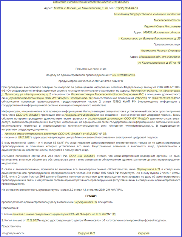 МнениеКомментарий инспектора Причина некорректно штрафа за неразмещение информации может возникнуть, когда инспекция вовремя не обратила внимание, например, что жители заключили прямые договоры или решили собирать средства на капремонт на спецсчете. Также не всегда оперативно в ГИС ЖКХ отражаются сведения о том, что дом перешел новой УО. Инспектор не сверяет информацию с реестром и выписывает штраф предыдущей организации. Это скорее проблема госжилинспекции. Подготовьте письменные разъяснения в ГЖИВо время проверки направьте в ГЖИ письменные пояснения и приложите подтверждающие документы. Пояснения в ГЖИ оформите на бланке организации и направьте их начальнику инспекции, где проводят проверку или выписали штраф. В названии письма укажите номер административного дела. По тексту опишите основание отсутствия вины за невозможность разместить информацию в ГИС ЖКХ. Распишите, когда вас оштрафовали, с чем связана невозможность разместить информацию и когда она возникла. Также укажите, что вы предприняли, чтобы разместить информацию Для каждого случая-основания избежать штраф приложите комплект подтверждающих документов. Заверьте их печатью организации и подписью руководителя. Такими документами могут быть скриншоты, протоколы ОСС, внутренние документы УО о смене руководителя. Эксперты системы подготовили примеры писем в ГЖИ на каждый из этих случаев и согласовали их с инспектором ГЖИ. Чтобы скачать письма, нажмите на соответствующую кнопку под картинкой письма. Под примерами писем вы найдете видеоинструкцию, как его заполнить и адаптировать под свою организацию. |