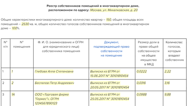 Рисунок 2. Пример реестра собственников помещений в МКД