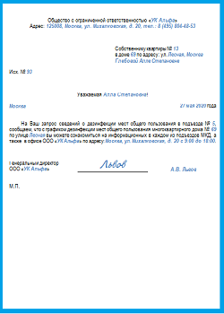 Ответ на запрос собственника о предоставлении сведений о дезинфекции МКД