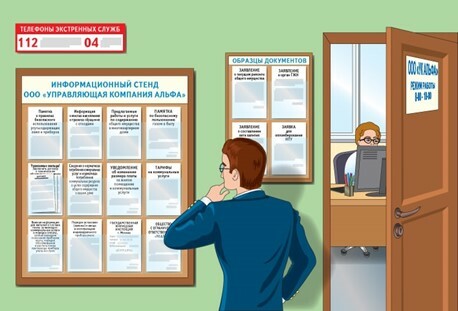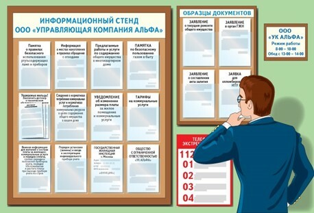 На большом стенде разместите информацию об организации в полном объеме, информацию о коммунальных услугах, перечень работ и услуг, сведения об обращении с отходами и пр. Пример оформления стенда мы показали на рисунке 3.