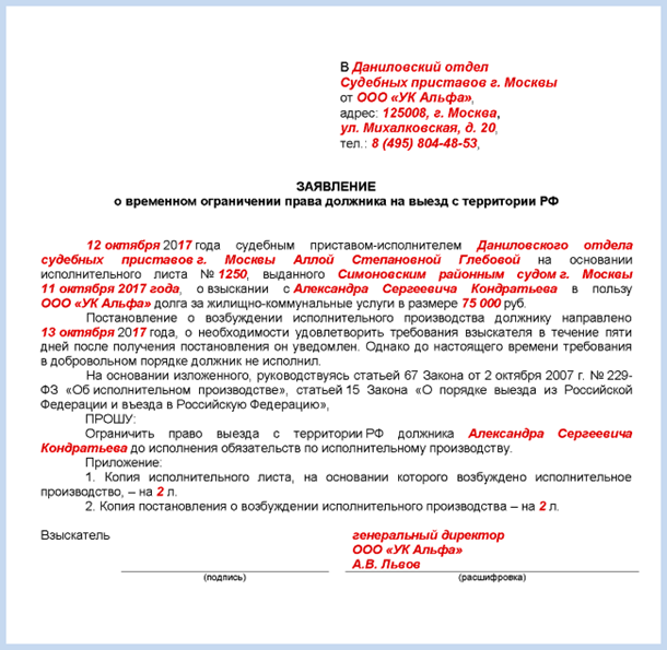 Если у вас есть судебное решение и исполнительный документ по долгу за ЖКУ, заявление о запрете на выезд подайте судебному приставу-исполнителю.