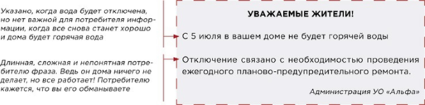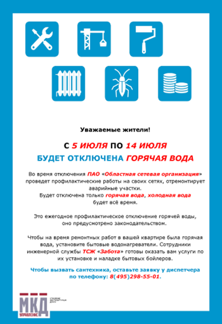 В объявлении укажите период перерыва и вид КУ, подачу которой собираетесь приостановить. На рисунках мы рассмотрели хорошие и не очень примеры оформления объявлений об отключении горячей воды.