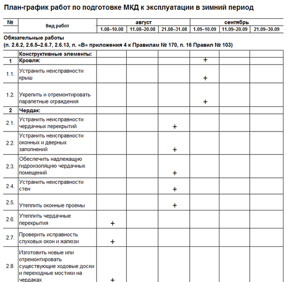 Таблица 1. Пример работ, которые включают в план-график до наступления холодов