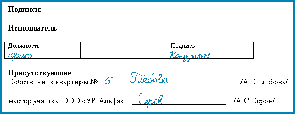Акт подписывают участники: представители УО, ТСЖ, ЖСК и собственник помещения. К примеру, акт подпишут юрист УО по доверенности и собственник помещения. Если собственник отказывается подписать акт, сделайте об этом пометку.