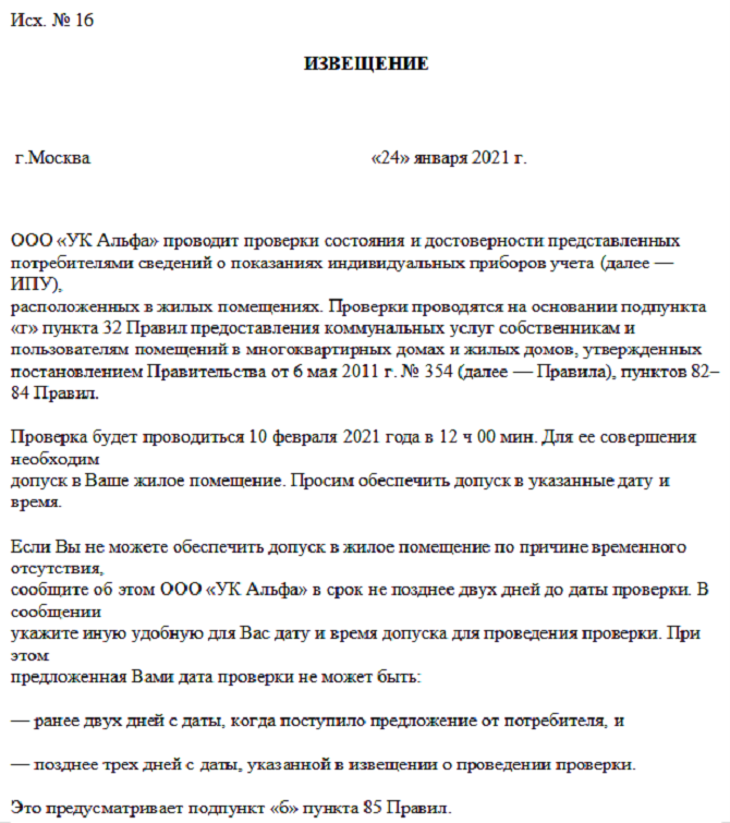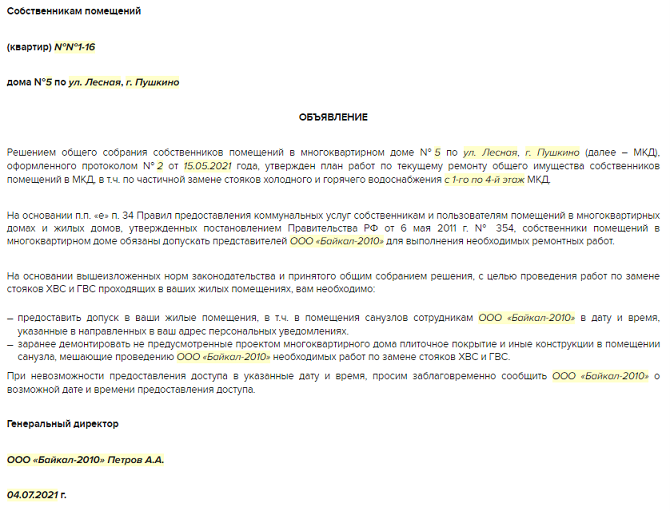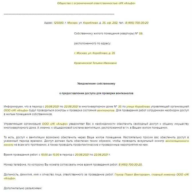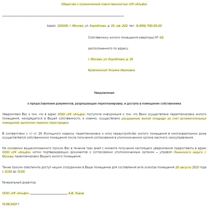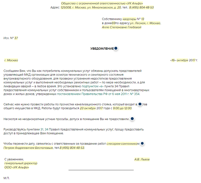 Подготовьте и направьте стандартное уведомление о том, что для выполнения своей работы УО, ТСЖ, ЖСК нужен доступ в помещение собственника для осмотра или ремонта общего имущества, проверки ИПУ.