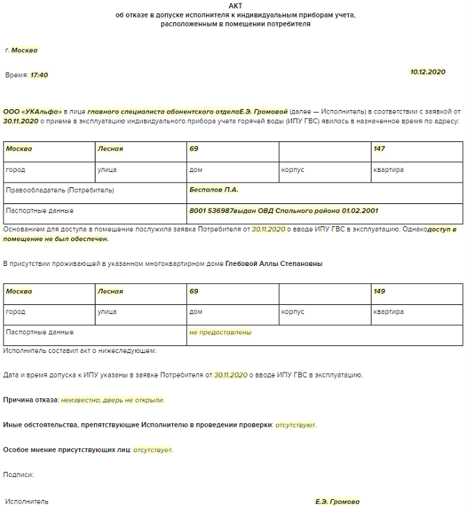 Если так и не удалось попасть в помещение и получить доступ к общему имуществу, оформите акт. В акте об отказе предоставить доступ укажите основание для доступа и причину отказа.
