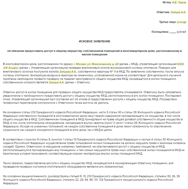 Исковое заявление об обязании собственника предоставить доступ в помещение к инженерным сетям, относящимся к общему имуществу собственников