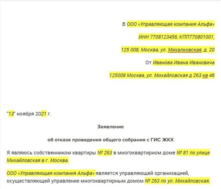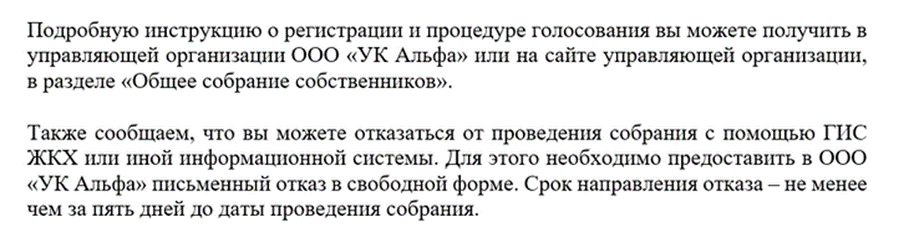 Подробные правила доступа к системе, порядок отказа от онлайн-собрания и образец такого отказа можете разместить на сайте или в офисе управляющей МКД организации. При этом в сообщении необходимо указать, где можно найти такие правила.