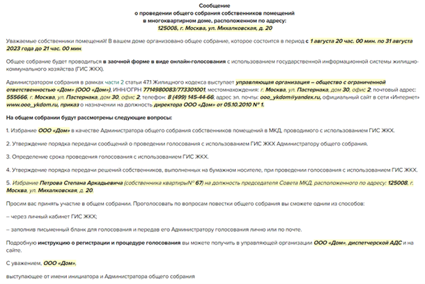 Требования к содержанию сообщения установлены частями 4, 5 статьи 47.1 ЖК.