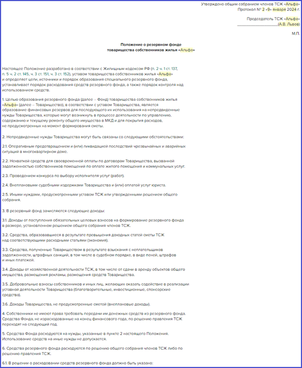 Положение о резервном фонде в ТСЖ регулирует организационные вопросы работы с его средствами. В положение включите подробный порядок создания и функционирования фонда: