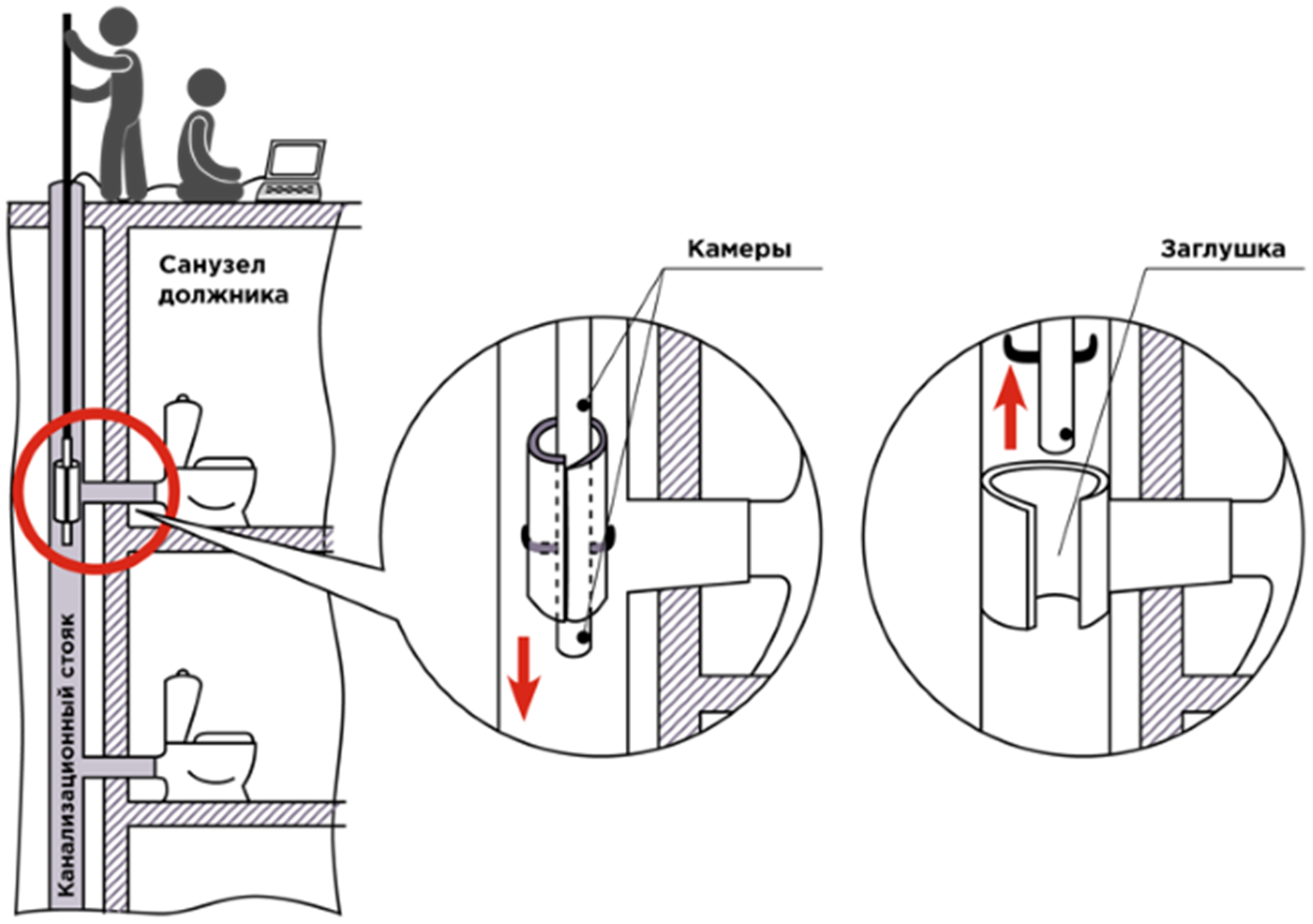 Чтобы огранить водоотведение, используют трос или зонд с манипулятором, видеокамеру и непосредственно заглушку. Трос спускают в стояк, отсчитывают расстояние до квартиры должника в метрах. Найти врез в квартиру помогает видеокамера. В нужное отверстие манипулятор устанавливает заглушку. Время проведения работ по отключению занимает до 40 минут и зависит от уровня расположения квартиры должника.